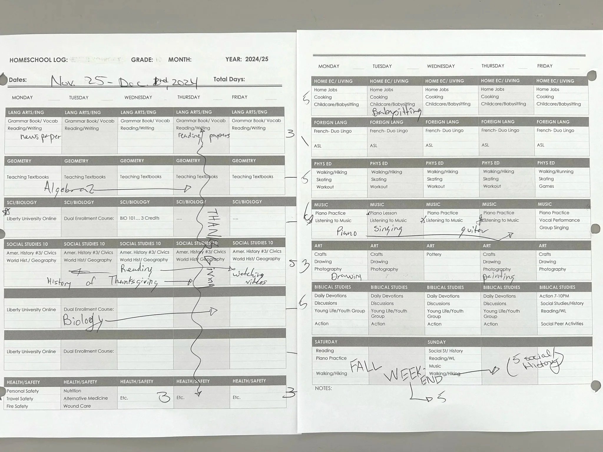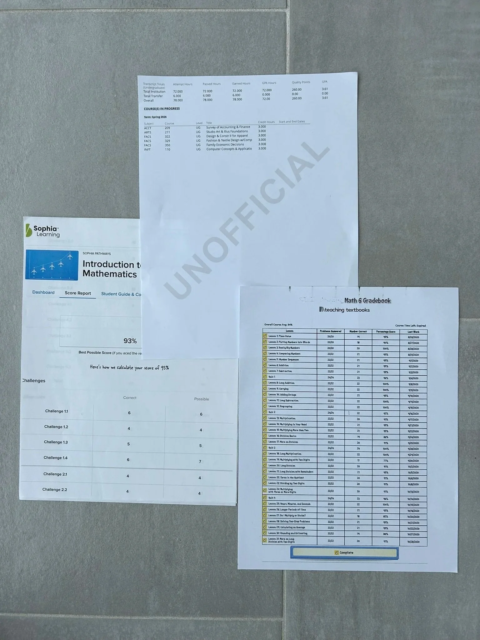 ONE PICTURE of completed scores from the required Standardized Achievement Tests from a state approved source. These are only required in Pennsylvania for 3rd, 5th, and 8th Grade. Example not shown.